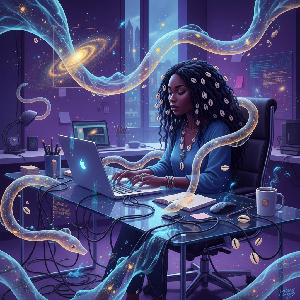 Mami Wata, the serpent spirit of waters and transformation, has specific medicine for modern work challenges. She governs flow states, abundance, healing, and the ability to move fluidly between different realms, which is basically a perfect job description for thriving in today's shapeshifting work environment.
