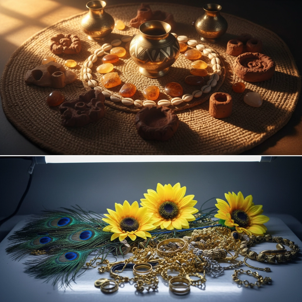 Traditional Yoruba iconography for Oshun centers on brass, honey, amber, and river symbols: not peacocks or sunflowers. The mermaid association, while beautiful, comes from later syncretic traditions where water spirits from different cultures blended together. These symbols aren't "wrong," but presenting them as traditional Yoruba practice misleads people about the actual source culture.